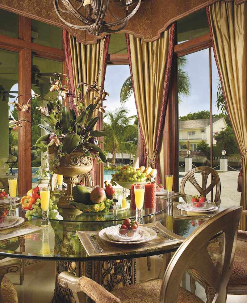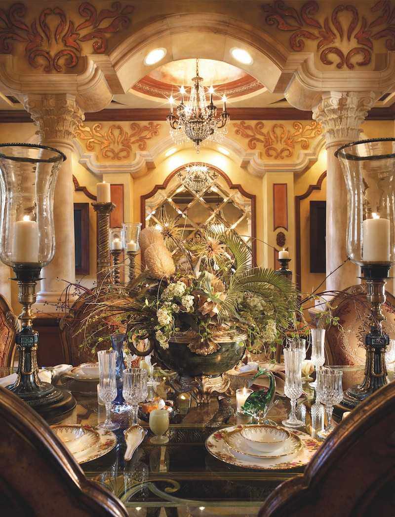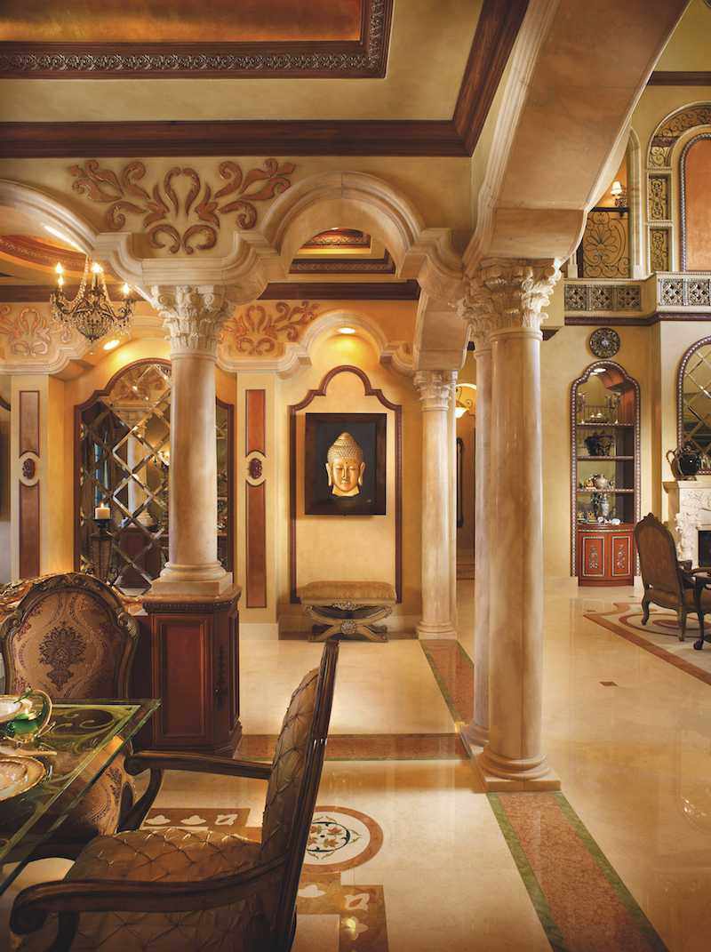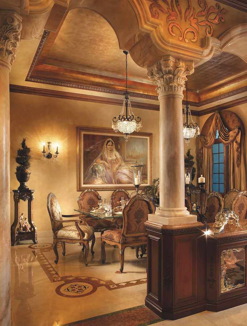 - Gupta-dining vignette: Here we can see the entire formal dining room area, skillfully defined with marble Corinthian columns that lead the eye upward. Hand-gilded detailing delights the eye as does the beautifully draped Roman arch windows.