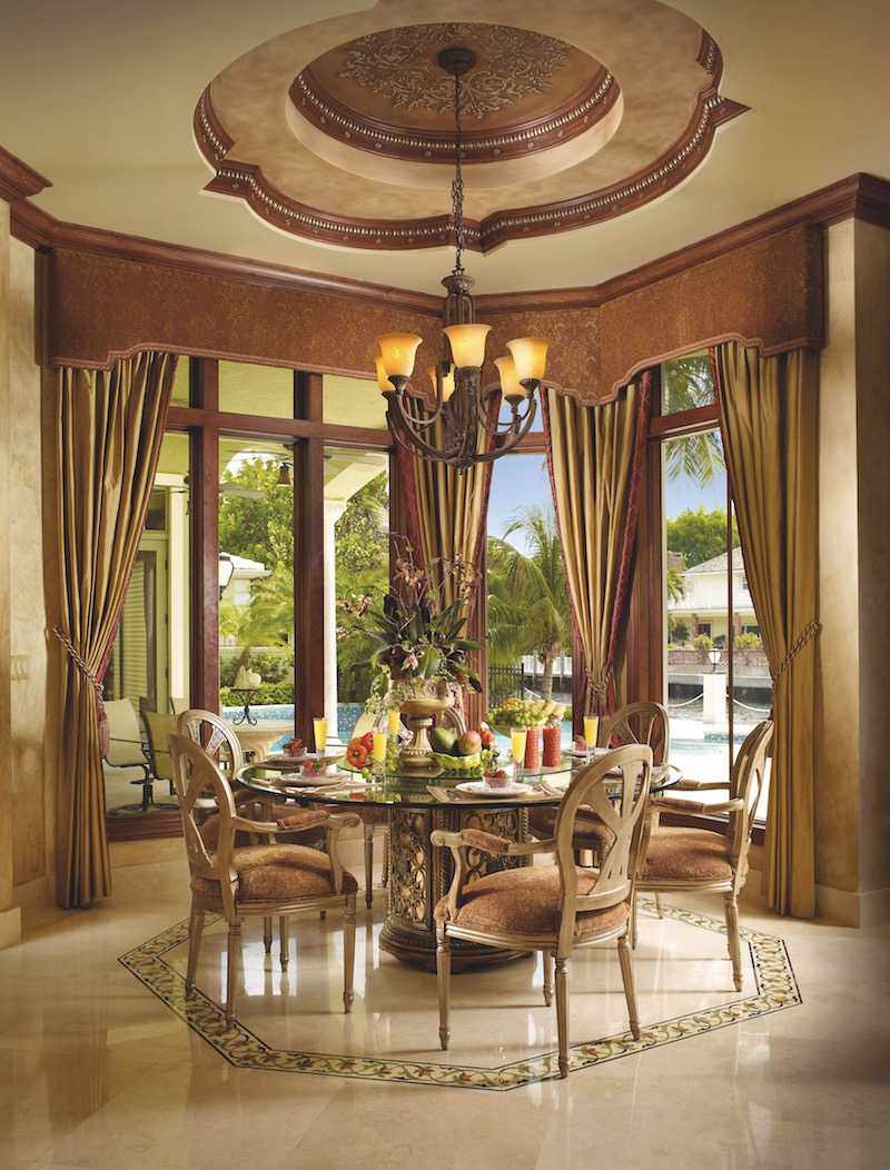 - The breakfast room features a round glass table with six upholstered armchairs placed over a custom inlaid marble border motif that adds visual interest and contrast. The distinctive ceiling design was enhanced with a faux-painted leather look punched with silver gilded details.