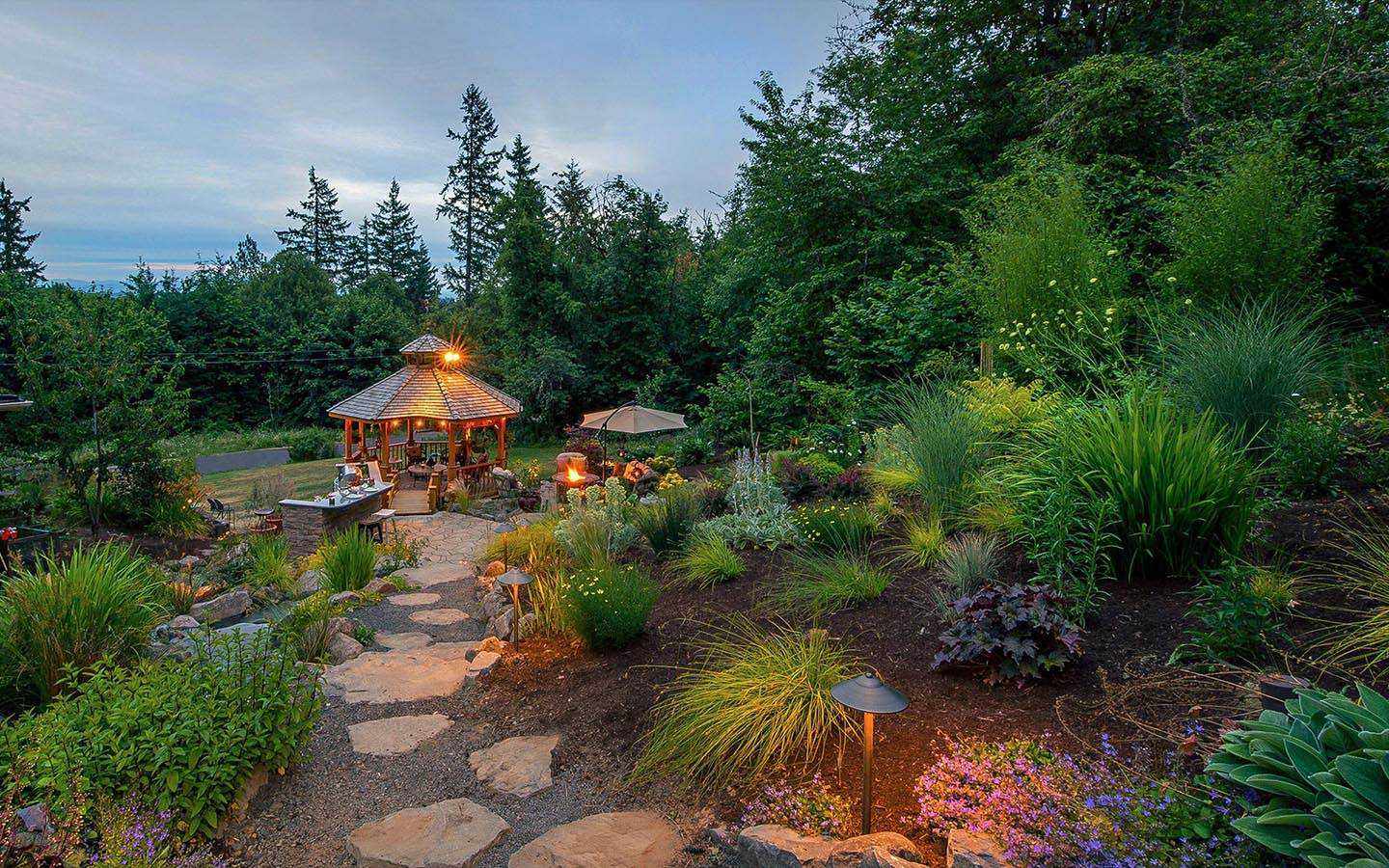 The gazebo offers a peaceful refuge, the firepit with shade umbrella makes an inviting reading nook.
